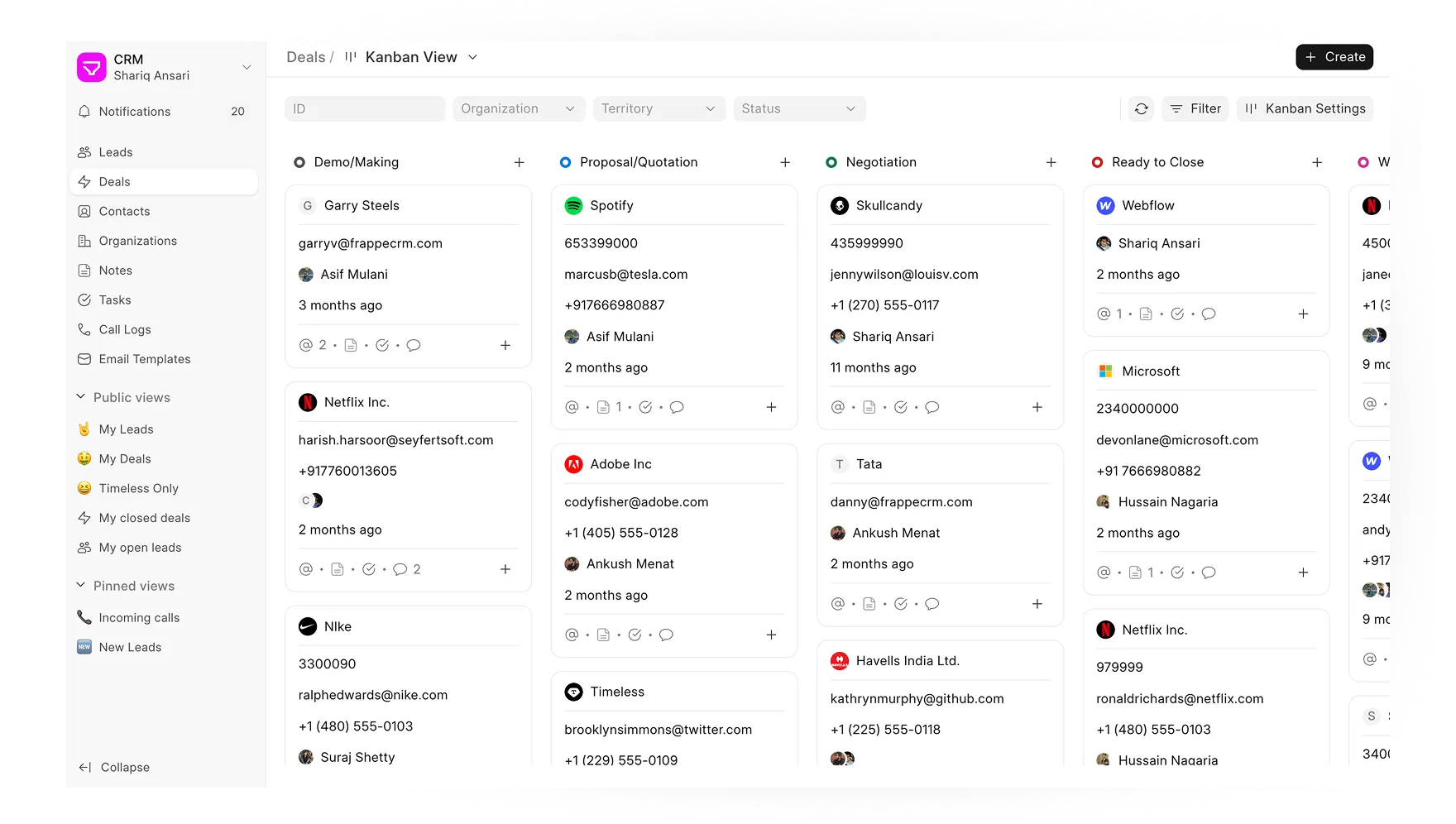 Visualize your sales pipeline with the Kanban view. Move deals through customizable stages.